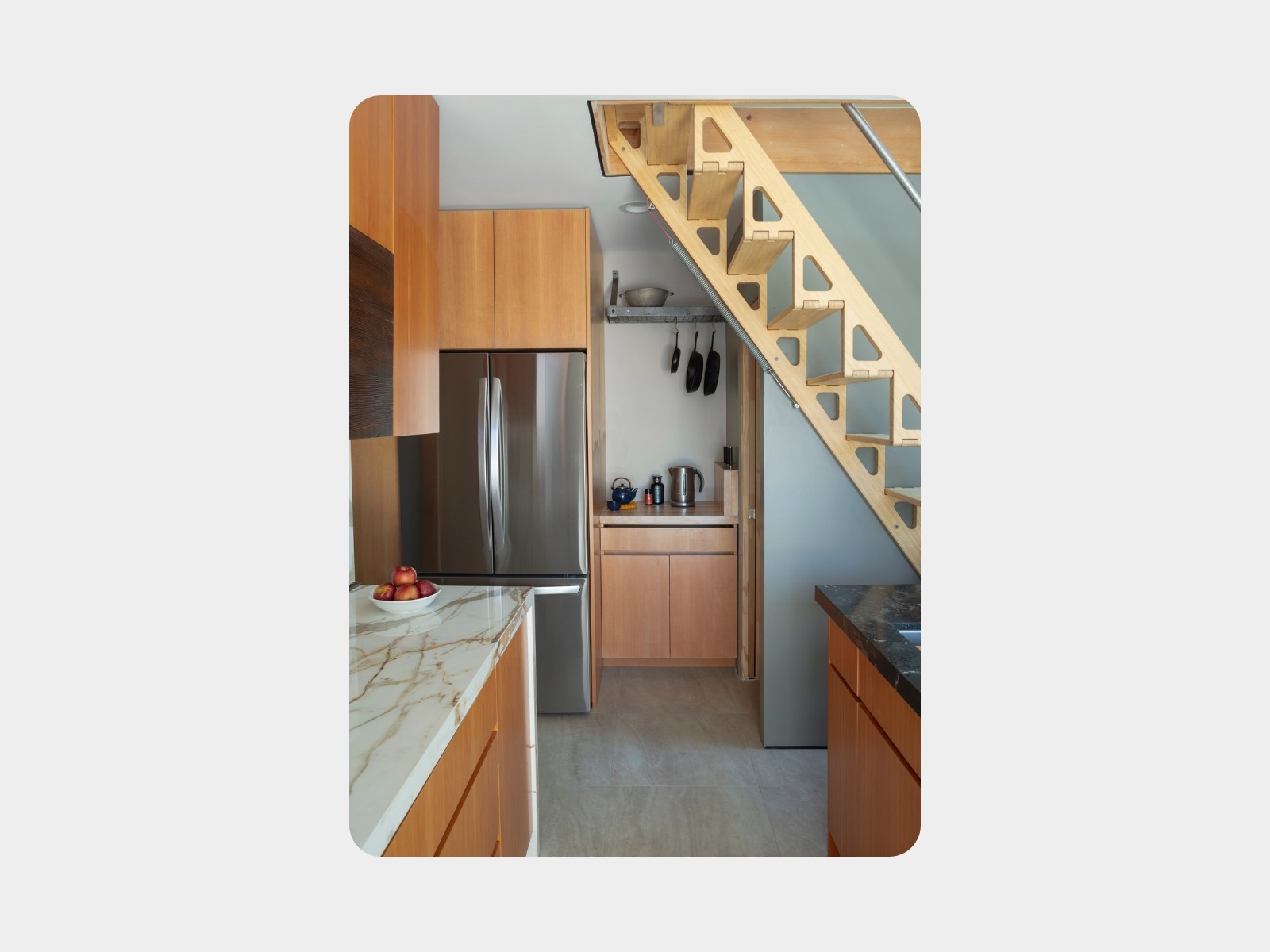 Instead of permanently occupying space, a wall-mounted folding stair allows the kitchen to remain open and functional throughout the day.